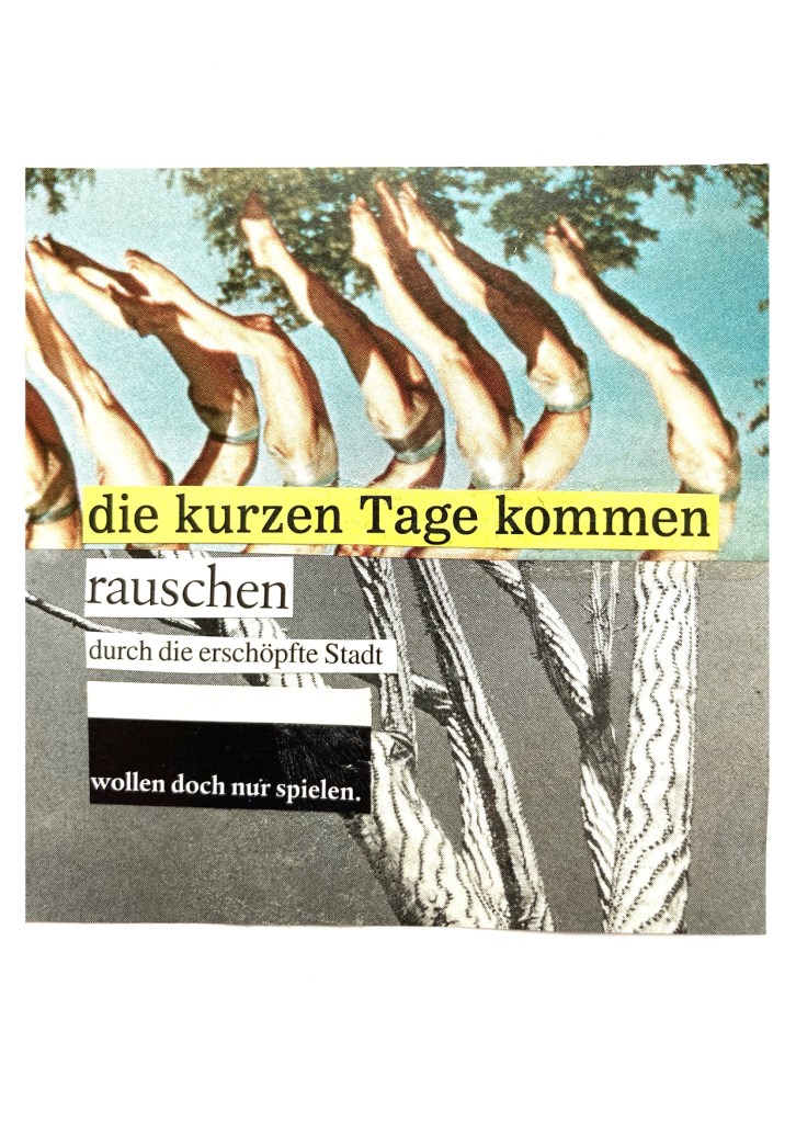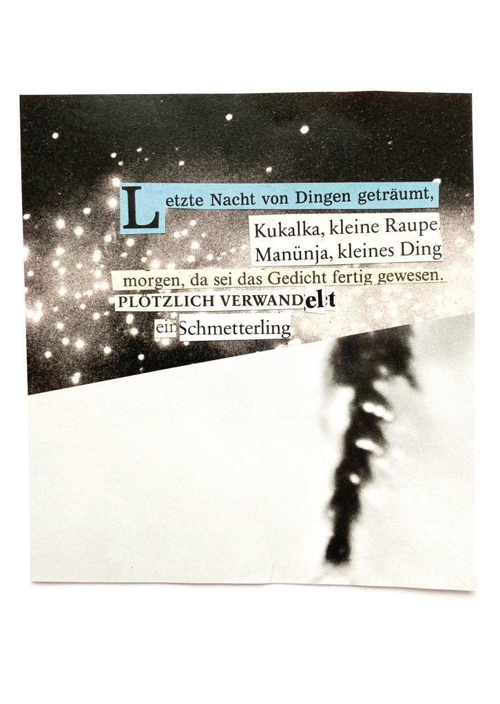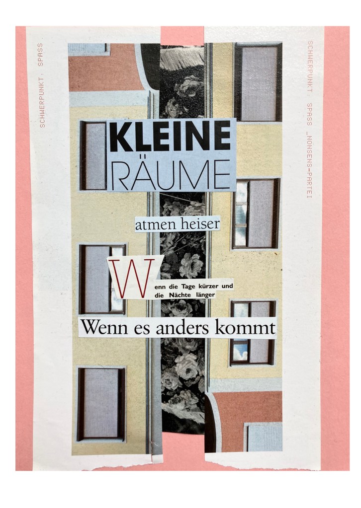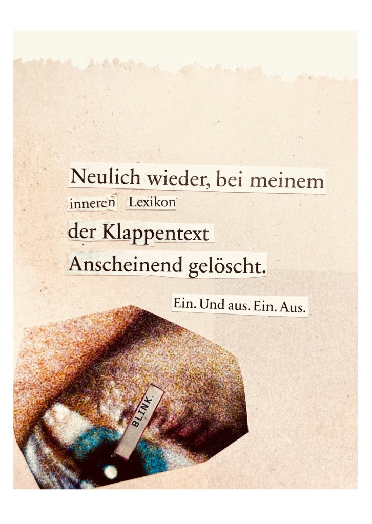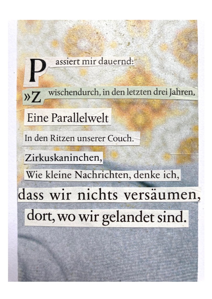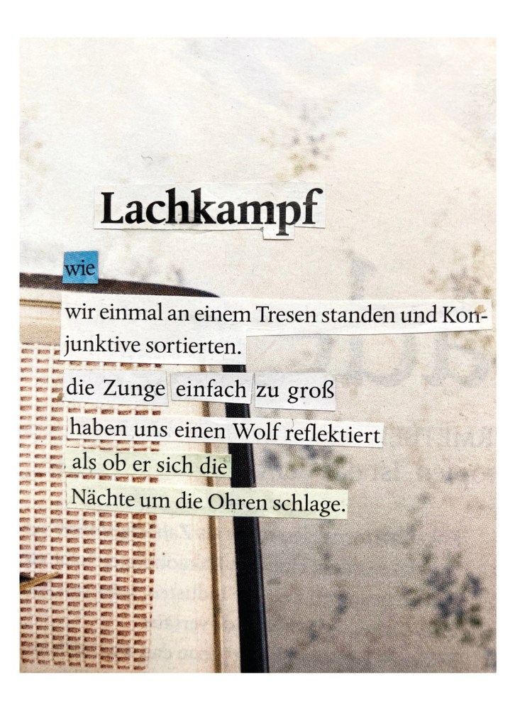 Der Abendspaziergang im Lockdown I, der an einer „Zu verschenken“-Kiste mit einem Stoß alter Zeitschriften vorbei führt. Diese als Lektüre mit nach Hause nehmen, um nach dem zweiten Heftdem Impuls nachzugeben: tausend Schnitte, Wörter, Phrasen, Buchstaben, Bilder. Ich beginne zu spielen. Rekonfigurieren #austekstmachneu